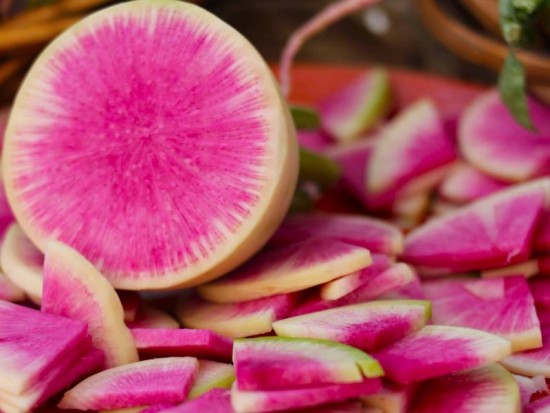 Variété originaire de Chine, aussi appelée radis pastèque car sa saveur est plus douce et moins piquante que le radis classique.